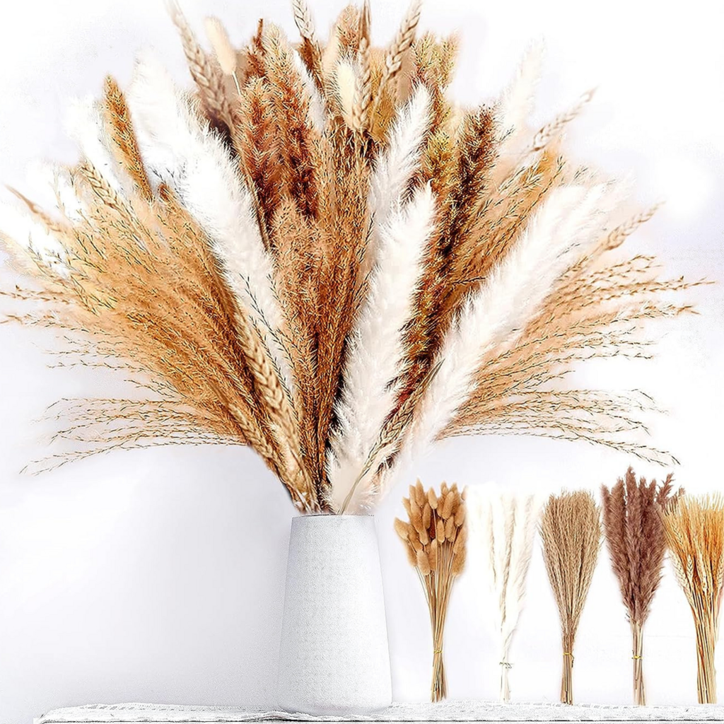A soft and fluffy faux pampas grass set available in five stunning colors: Jet Black, Creamy White, Dark Beige, Royal Blue, and Silver Grey, perfect for chic home décor