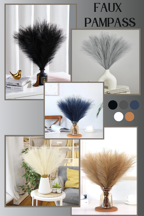 A soft and fluffy faux pampas grass set available in five stunning colors: Jet Black, Creamy White, Dark Beige, Royal Blue, and Silver Grey, perfect for chic home décor